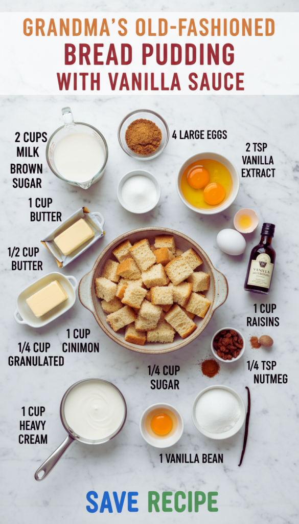 From my kitchen to yours—GRANDMA’S OLD-FASHIONED BREAD PUDDING WITH VANILLA SAUCE mixes everyday ingredients with a cozy aroma. Tested, tasted, and ready for your table. GRANDMA’S OLD-FASHIONED BREAD PUDDING WITH VANILLA SAUCE is that cozy, no-fuss dessert you reach for when there’s a half loaf of stale bread on the counter…