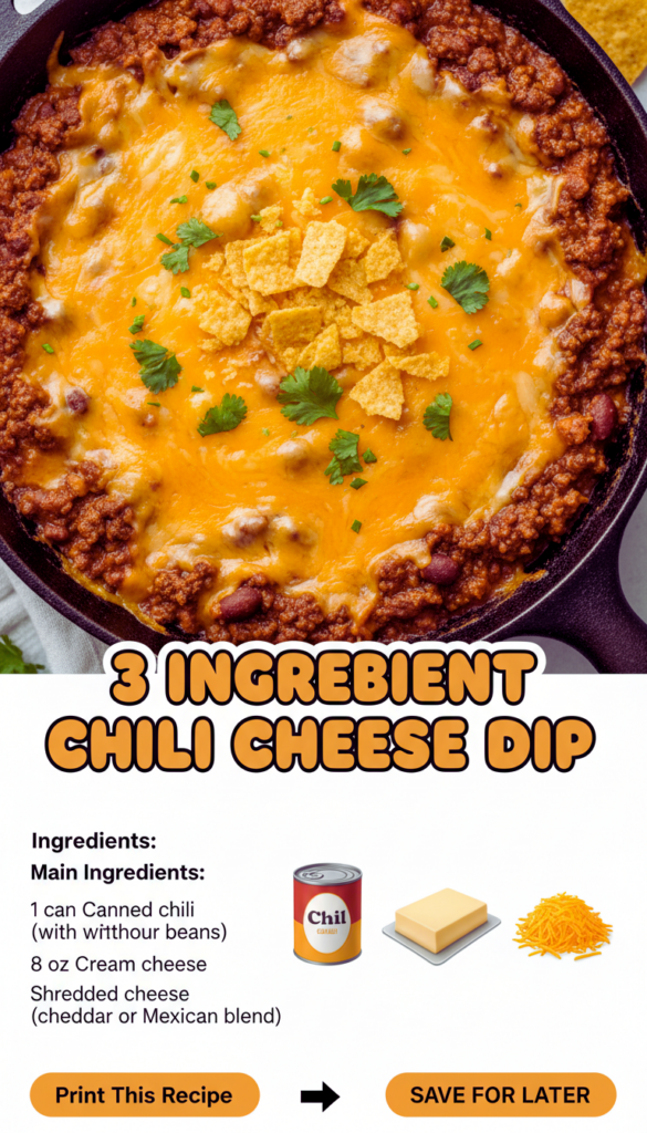 If you need a reliable, no stress snack, 3 INGREDIENT CHILI CHEESE DIP is the one to keep in your back pocket. It’s warm, filling, and honestly kind of addictive with a big bowl of Fritos on the side. If you want to see other takes and tips, I’ve also enjoyed reading 3-Ingredient Chili Cheese Dip – 12 Tomatoes and Crowd Pleaser: Easy 3 Ingredient Chili Cheese Dip! – Instrupix. Try it once and you’ll get why people ask for the recipe every single time. Now go grab those three ingredients and make your kitchen smell like the best kind of comfort food night.