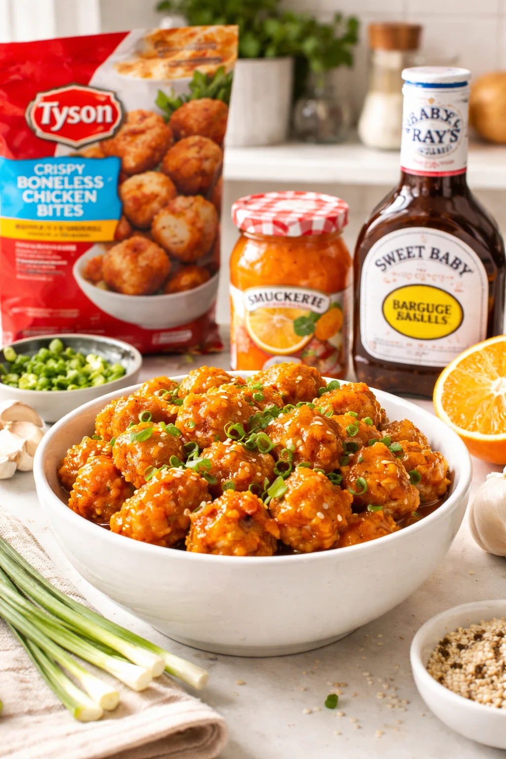 When I say four ingredients, I mean the core ingredients. I am not counting basics like oil for cooking, water for thinning sauce if needed, or optional garnishes like green onions. Those are up to you. Here is what you really need to make 4-ingredient Orange Chicken happen.
