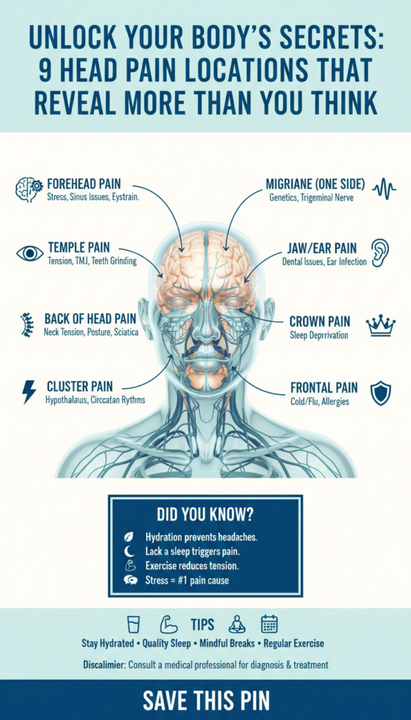Ever had a pounding head in just one spot and wondered if it meant something more than, say, skipping breakfast? โ9 Head Pain Locations That Reveal More Than You Thinkโ really hits home for meโliterally. If youโre like me, you probably just groan, pop an ice pack on your head, and pray it isnโt a migraine setting up camp for the weekend. But hereโs the surprising part: where your head hurts can actually spill the beans on whatโs happening inside. Kinda like when your face breaks out in the same place every month (I see you, chin pimple!), those pain zones can be little clues. Turns out, just like spots on your face connecting to internal organs or even where your tummy aches mean something different (read abdominal pain locations here), the map of your head can be just as revealing.
