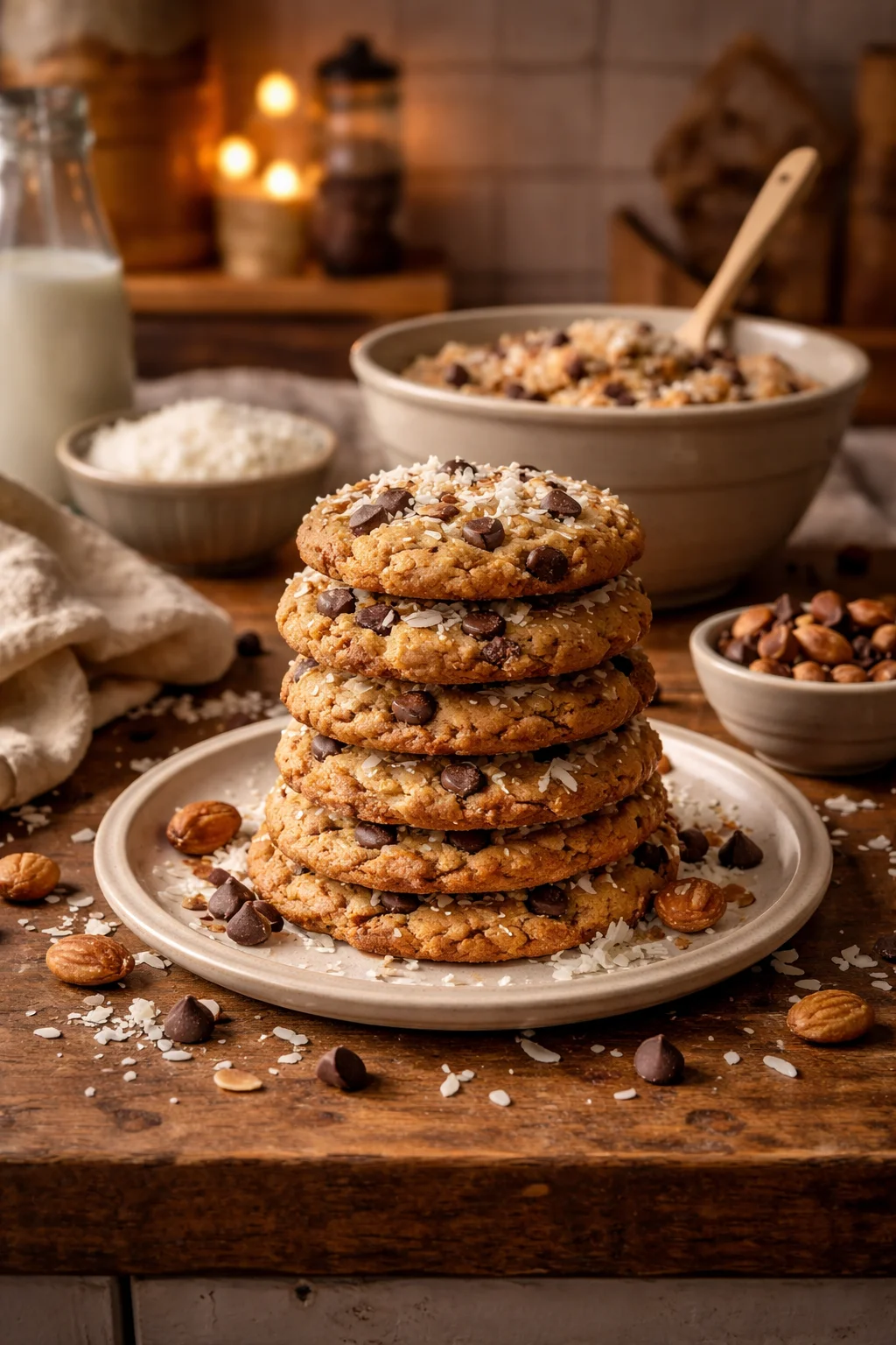 • Sweetened shredded coconut: This gives you that Almond Joy style sweetness and chew. Unsweetened works too, but the cookies will taste less candy like. If you use unsweetened, add an extra tablespoon or two of sugar or a drizzle of honey to balance it.