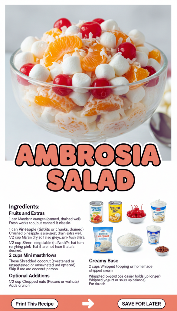 AMBROSIA SALAD is one of those magical recipes that actually improves after a little time in the fridge. The marshmallows soften slightly, the flavors mingle, and it just tastes more “together.”