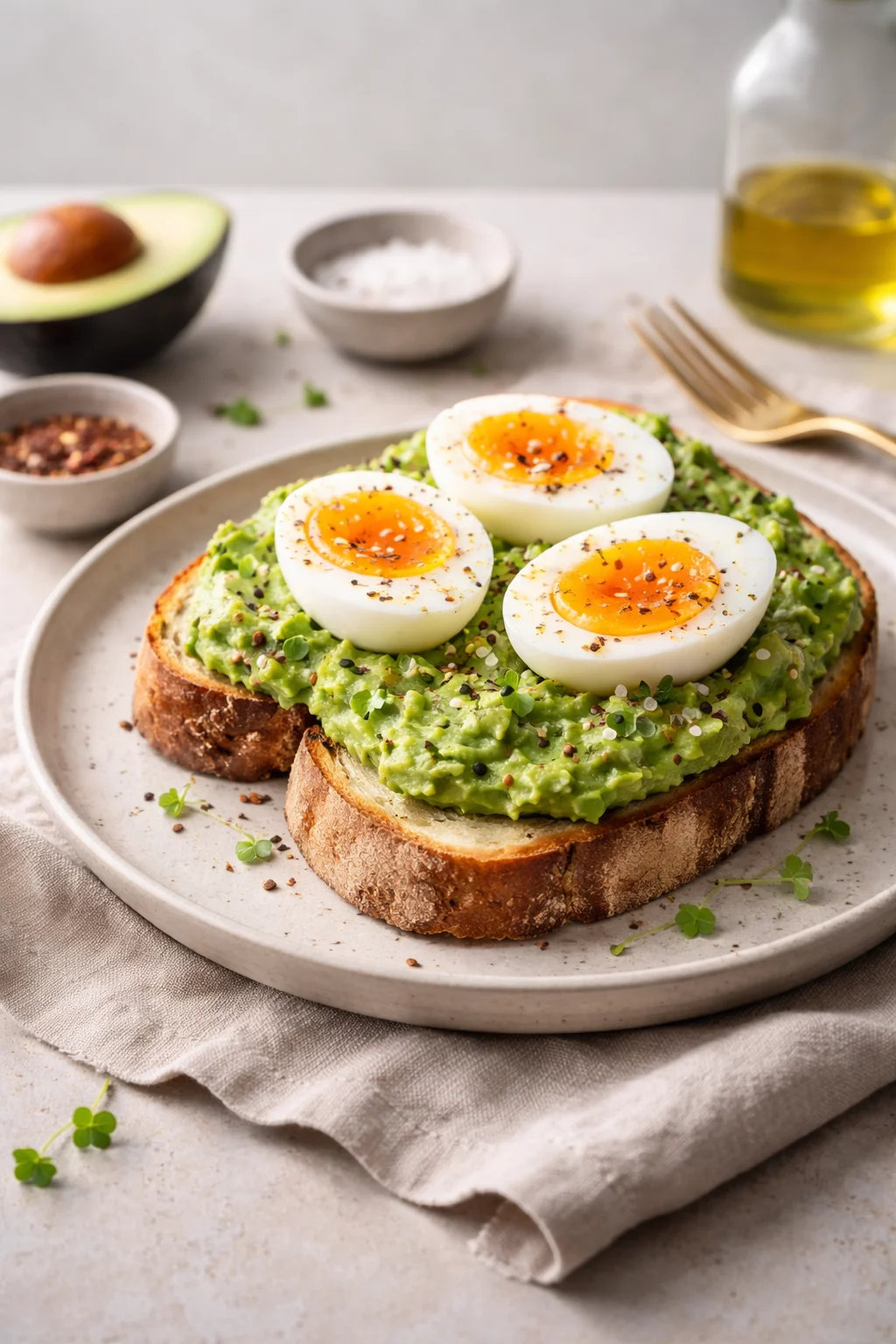 Toast the bread until it’s golden and sturdy. If you have extra time, brush it lightly with olive oil and toast it in a skillet for an extra crisp edge. Spread a generous layer of avocado on the toast. Slice your soft-boiled eggs in half and nestle them on top, yolks facing up. Finish with a pinch of flaky salt, pepper, and a tiny drizzle of olive oil. Done.
