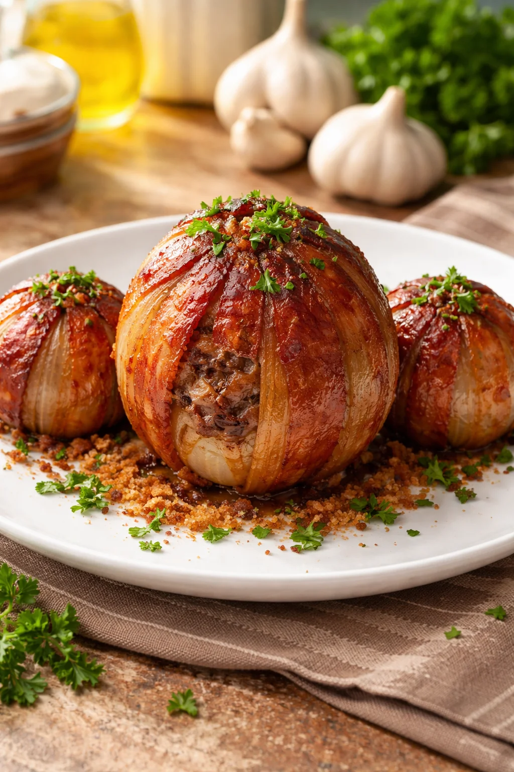 - Wrap each stuffed onion ball with 2-3 strips of bacon, overlapping the ends and securing with toothpicks.