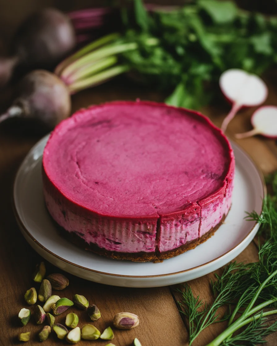 A creamy, savory cheesecake featuring whipped feta and sweet beetroot, topped with crunchy pistachio dust and fresh dill, perfect for brunch or as a classy appetizer.