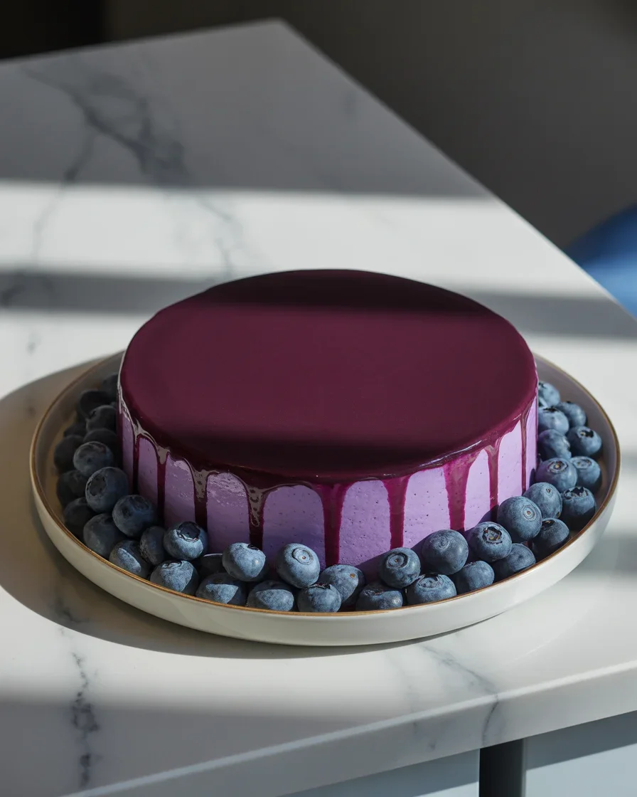 For a 9 inch cake: Use a standard springform or a silicone mousse mold with a 9 inch insert. Plan for 8 to 10 servings. You’ll want roughly 1.5 cups of blueberry puree for the glaze and center if you like a strong berry flavor, and about 2.5 cups of whipped cream folded into your mousse base.