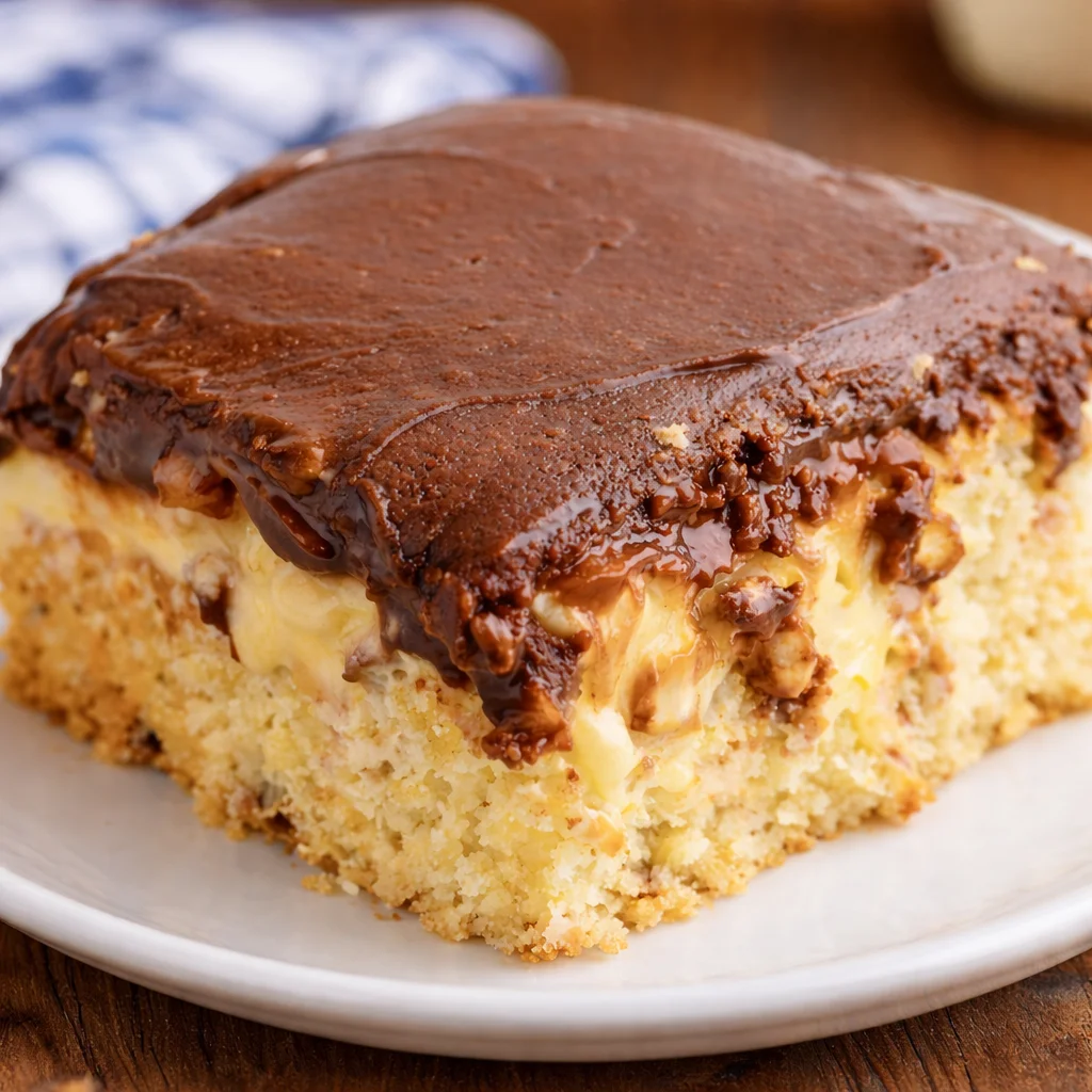 A soft, moist cake infused with creamy vanilla pudding and topped with a glossy chocolate layer, perfect for any occasion.