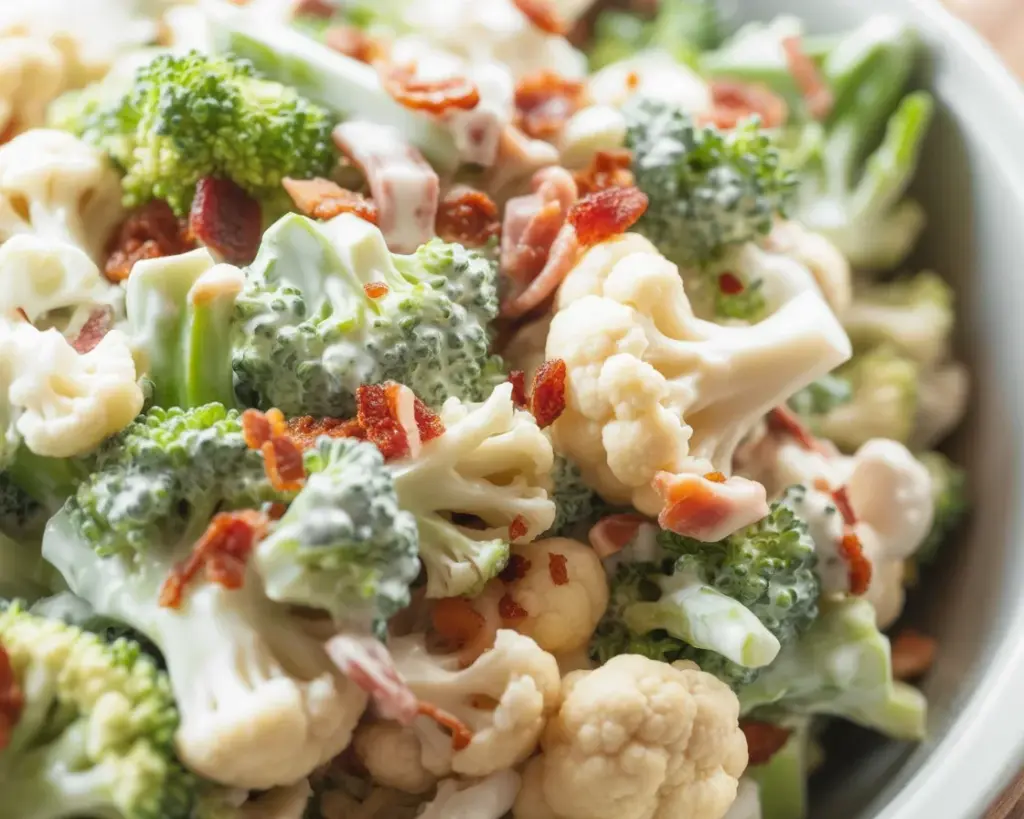 Make-ahead plan: Chop the broccoli and cauliflower, mince the onion, and make the dressing up to two days in advance. Keep the veggies and dressing separate in the fridge. Toss everything 30 to 60 minutes before serving. If you want to save time on the day-of, you can even pre-cook the bacon, crumble it, and store it in an airtight container.