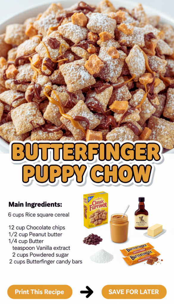 If you want a sweet snack that is fast, crunchy, and honestly kind of impossible to stop eating, this is it. BUTTERFINGER PUPPY CHOW comes together with simple ingredients and delivers big flavor without any baking drama. Try it once, then make it your own with little add ins or extra candy on top. And if you want to compare versions, you can check out Butterfinger Puppy Chow – Dang That’s Sweet and the official candy brand twist in Butterfinger Puppy Chow Recipe by @acozykitchen. Make a batch, grab a handful, and tell me if you managed to stop at just one serving.