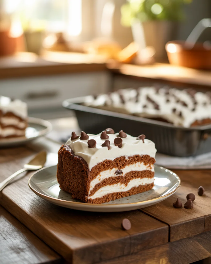 - Frost and chill: Spread the topping evenly over the cooled, soaked cake. Sprinkle with more mini chips and pistachios. Chill at least 2 hours, or overnight for the best texture.