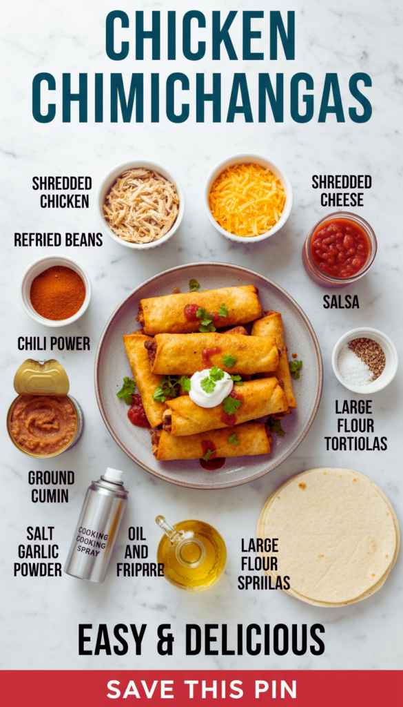 I lean into flavors that taste bold without being complicated: warm spices, gooey cheese, and a little tang from salsa or sour cream. And because this is a real life dinner, I also like that you can prep the filling ahead of time and just crisp the chimichangas when you are ready.