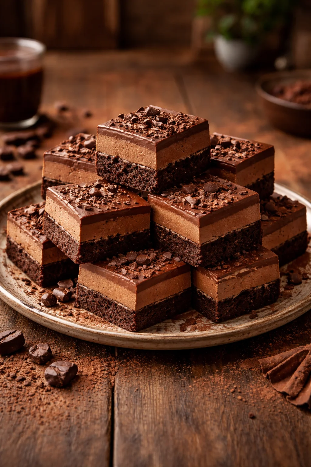 Think of these as a two layer dessert that acts like one perfect bite. The bottom is a dense, chewy brownie that is not too cakey. The top is a fluffy chocolate mousse that sets in the fridge, so it slices clean but still melts when you eat it.