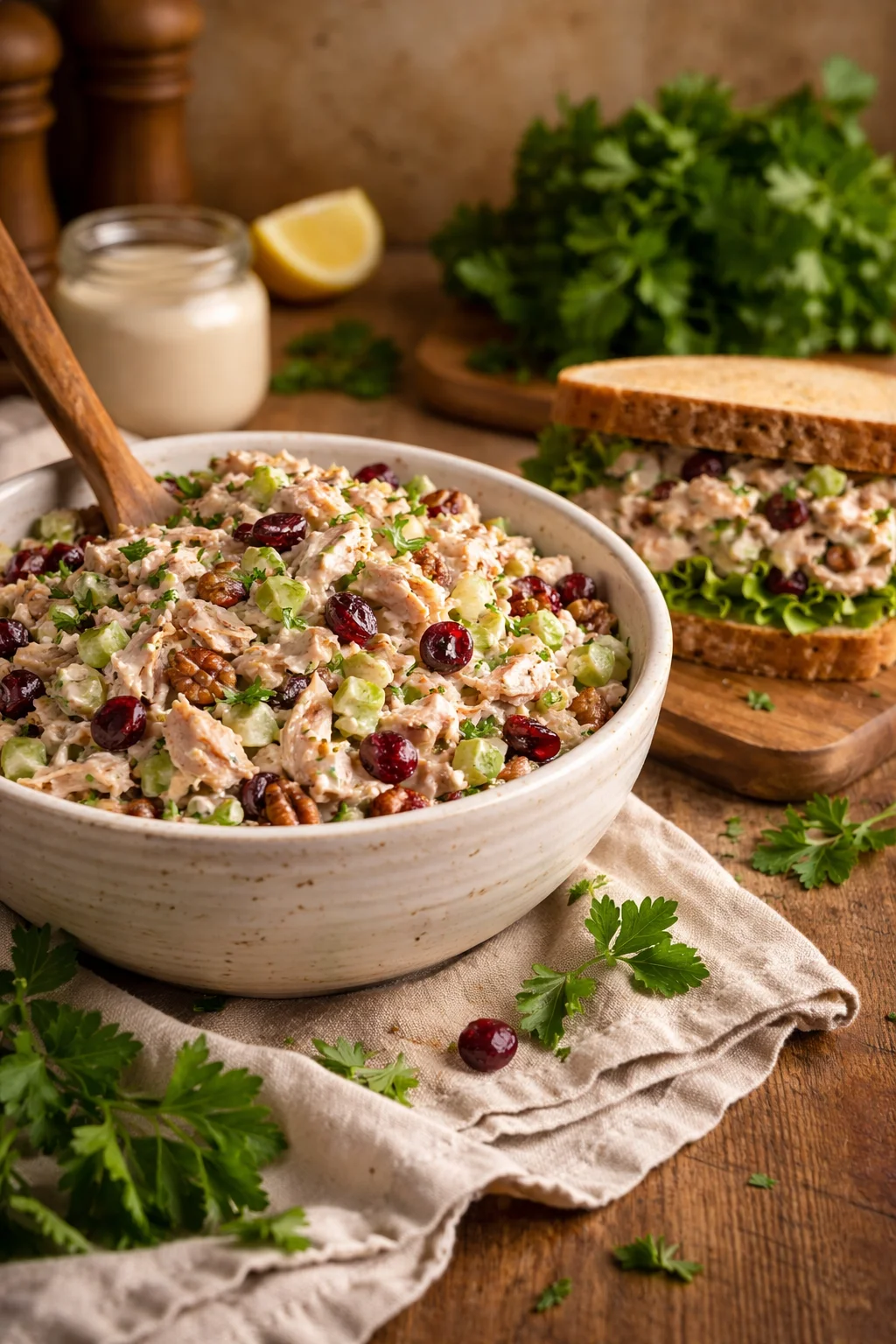 I mix the yogurt or mayo with Dijon and lemon juice first, then I fold in the chicken and crunchy stuff. I add cranberries last so they stay a little plump and do not get smashed around. If I have 10 extra minutes, I let it sit in the fridge so the flavors can mingle.