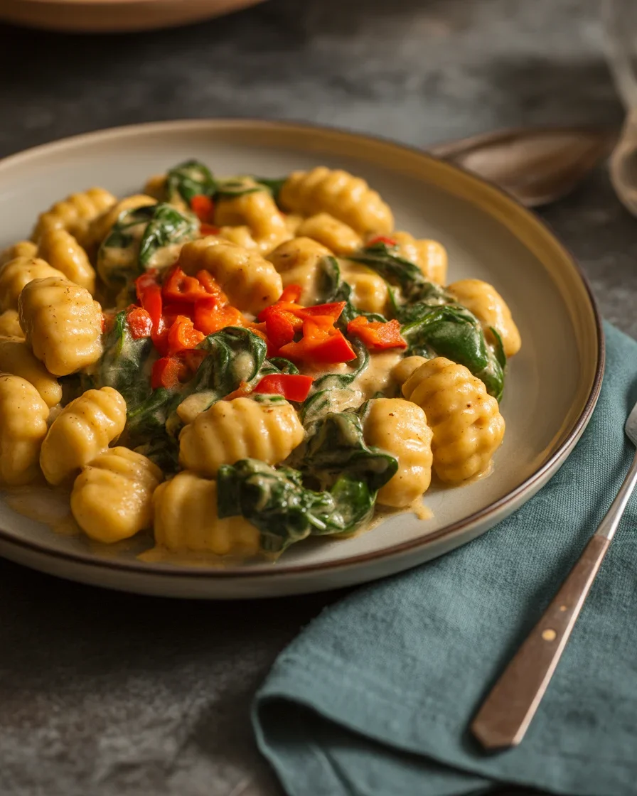 Stir in the gnocchi. Most packaged gnocchi cook in about 3 to 5 minutes. Cooking them in the sauce lets the starch thicken everything, so you get a silky finish without extra steps. If the sauce gets too thick, splash in a little more broth. If you love a green moment, fold in a couple of handfuls of baby spinach until it wilts.