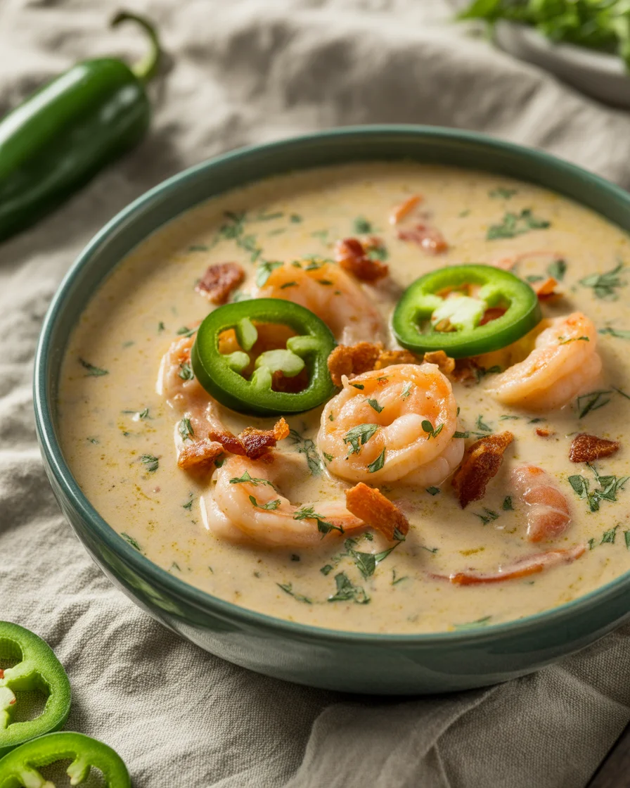 A quick and flavorful shrimp soup featuring spicy jalapeños and creamy goodness, perfect for warming you up on a chilly evening.
