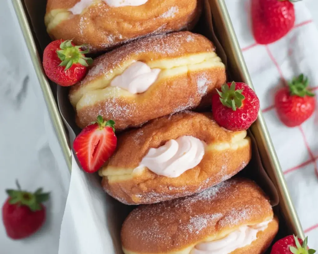 These playful donuts combine soft, warm dough with a creamy cheesecake center and a sweet strawberry filling, making them perfect for brunch or special occasions.