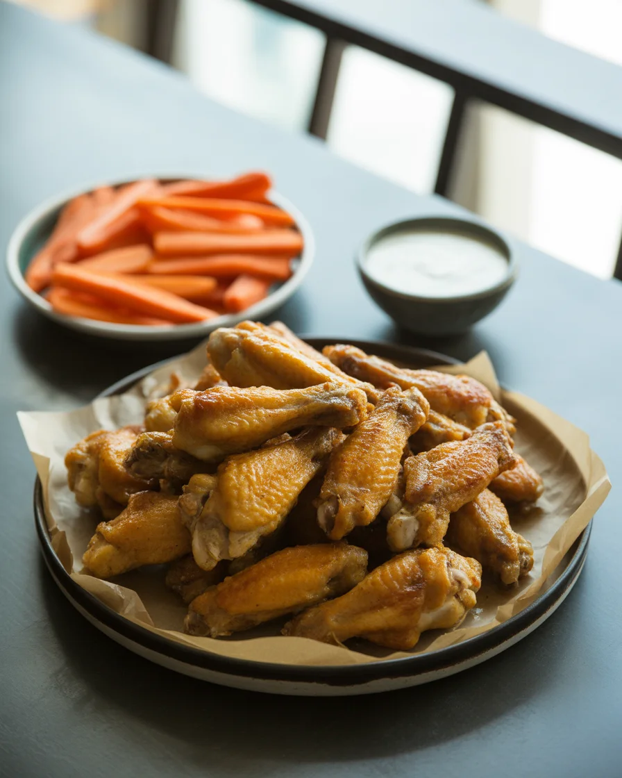 Oven strategy is straightforward. Preheat to a solid 425°F so the wings hit a hot environment right away. If you have convection, use it. Arrange wings on a rack over a foil lined pan for extra air flow. Bake, flip halfway, and let them go until the color deepens and the skin looks blistered in spots. Rest them a couple minutes so the juices settle. That’s it.