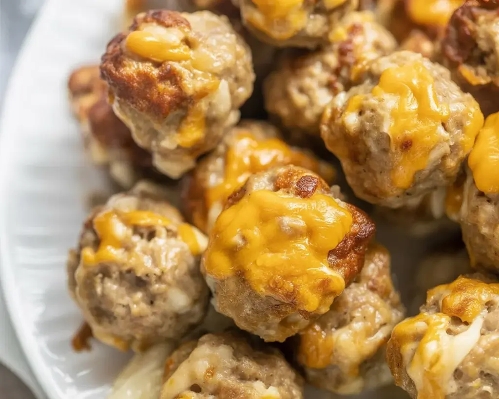 Here’s what I notice every time. The outside bakes up lightly golden and crisp, and the inside is soft with tiny pockets of melted sharp cheddar. The cream cheese helps bind everything, so the balls bake evenly and don’t crack. It also balances the saltiness of the sausage. If you’ve had sausage balls that feel chalky or too dry, this version fixes that completely.