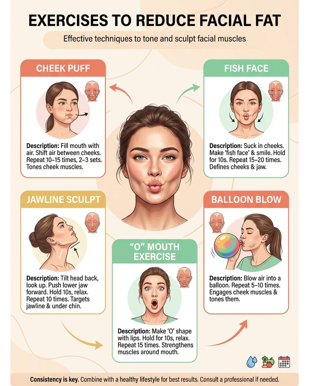 - Fish Face: Suck in your cheeks, hold for 10 seconds, repeat 10 times. Youโll look goofy, but it works.