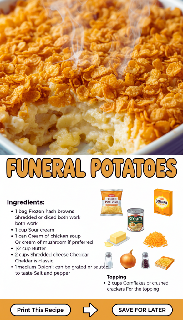 This name can catch people off guard if they have never heard it. Funeral Potatoes got popular because they are commonly served at post funeral lunches, especially in parts of the Midwest and in communities where people bring food to support a grieving family. It is not fancy food, and that is the point. It is warm, filling, and it feeds a lot of people without costing a fortune.
