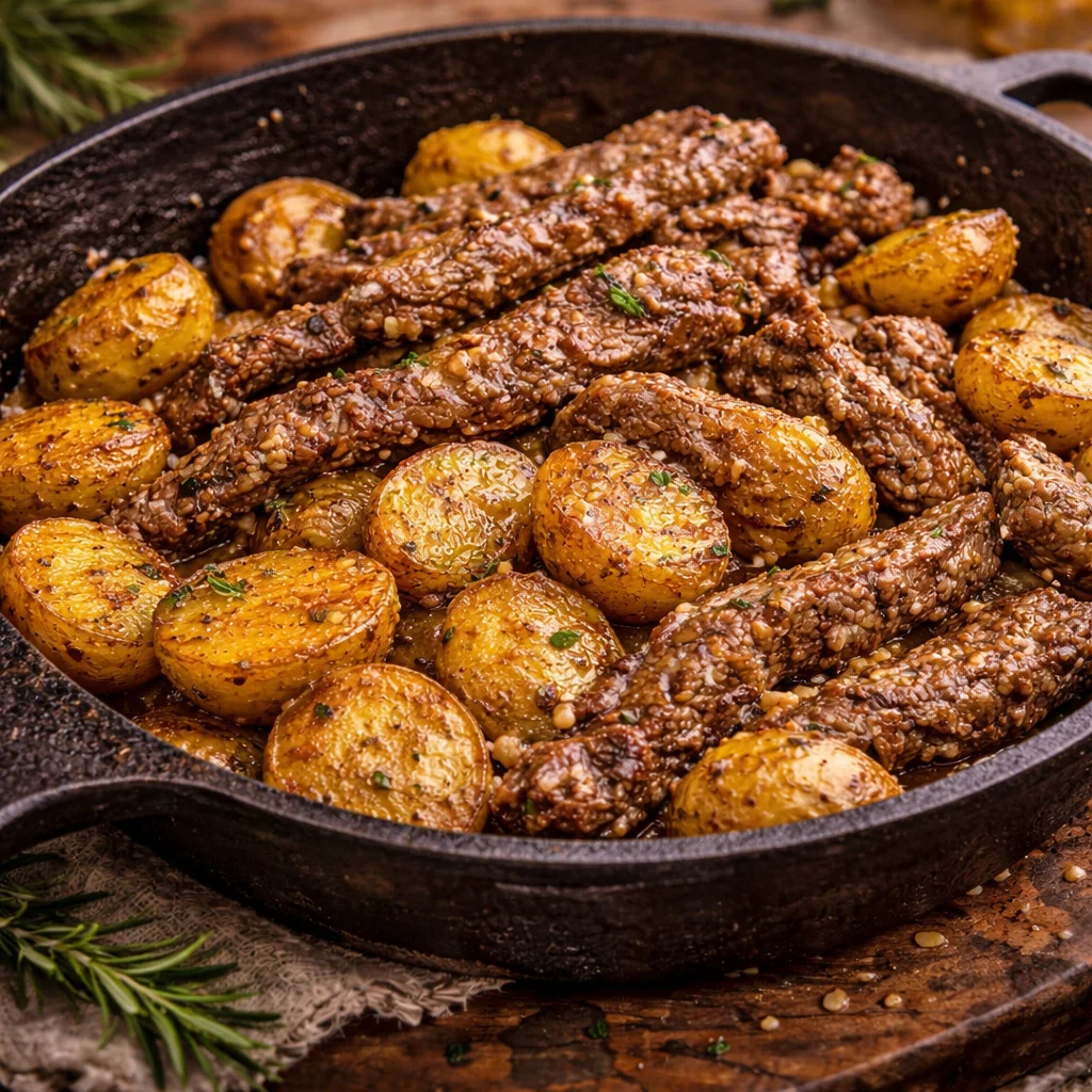 A quick and cozy dinner with crispy potatoes and juicy steak, tossed in garlic butter for a flavor-packed meal.