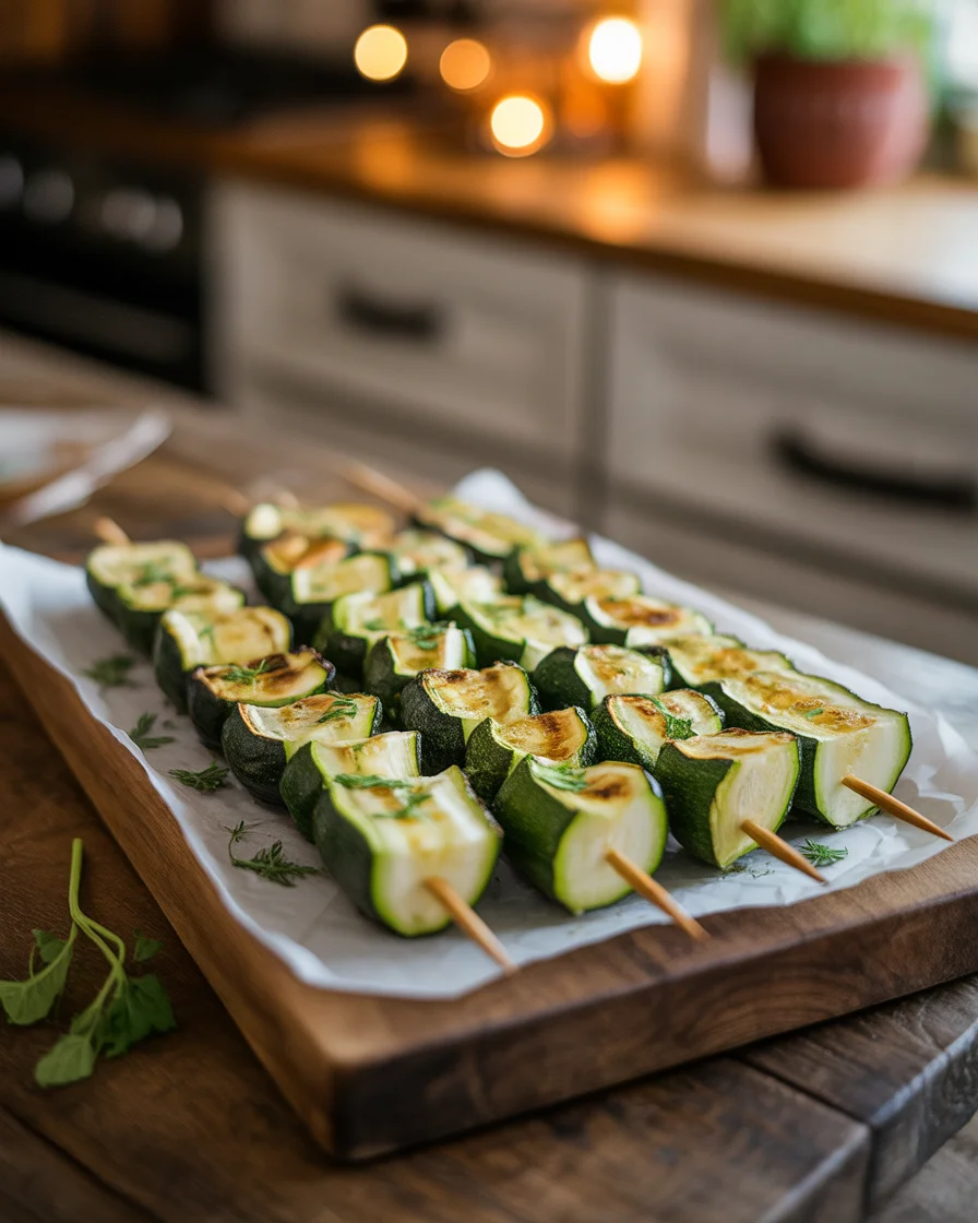 - Thread the zucchini pieces onto the skewers, leaving some space between each piece for even cooking.