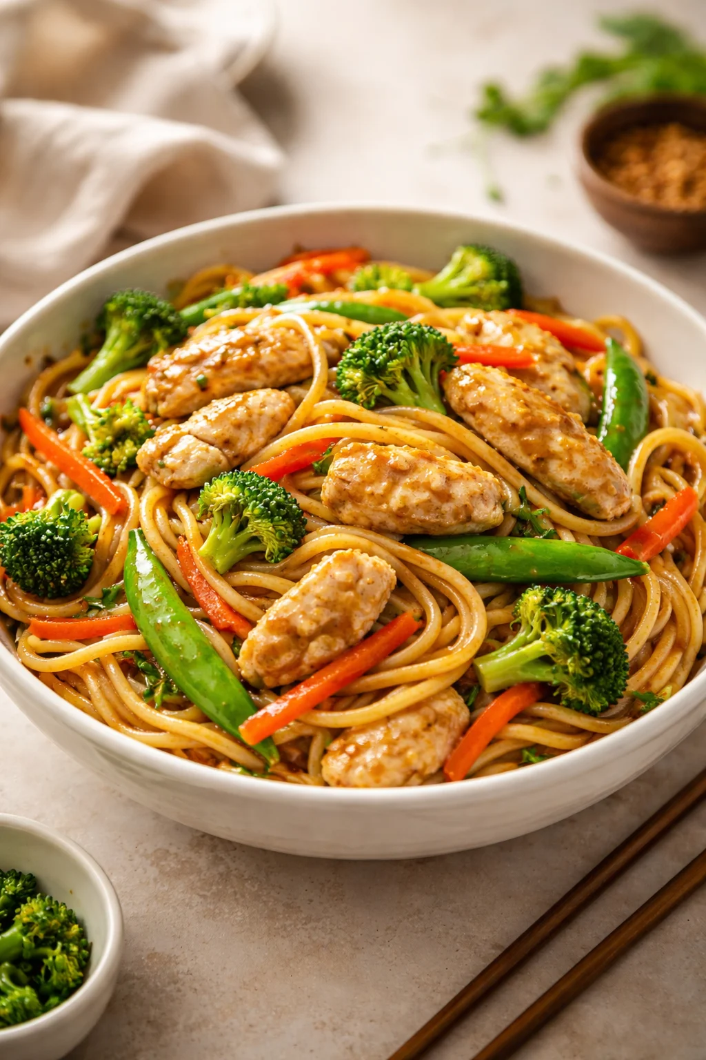 A quick and cozy dish that brings the flavors of takeout home, featuring tender chicken, flavorful vegetables, and noodles tossed in a garlicky sauce.