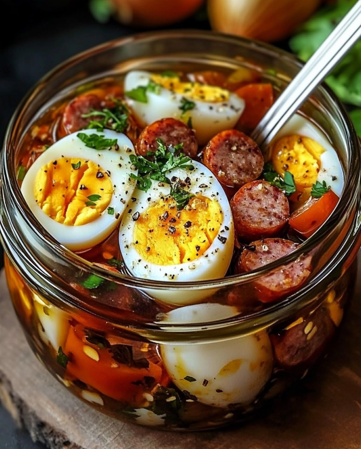 - In a clean jar, layer the eggs, onions, and sausage. Repeat until the jar is full.