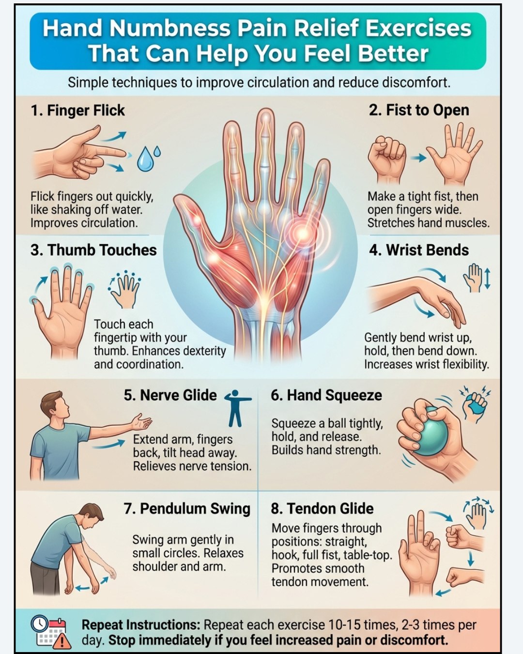 How often should I do hand numbness pain relief exercises?