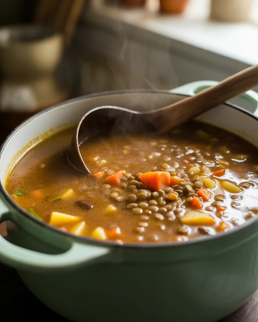 Now, for the broth: chicken, veggie, whatever. Toss in a can of tomatoes if you’re feeling wild. No one will stop you. Season generously—salt, pepper, a bay leaf if you’re fancy. Simmer until the lentils and potatoes are tender. Taste, then panic over your salt content, then relax when you realize it tastes great.