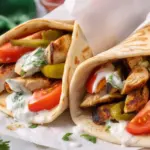 - Warm pita or flatbread until soft. Spread garlic sauce or tahini, add chicken, and top with tomatoes, cucumbers, onions, and pickles.