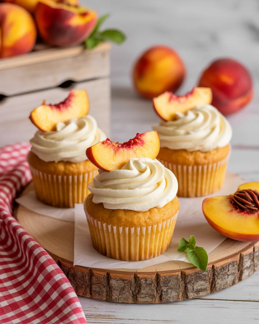 What I love most here is the texture story. The cupcake is soft and fluffy, the peach bits are juicy, and the frosting is creamy with just enough structure to pipe. A little drizzle of honey on top or a tiny slice of peach makes them look bakery cute without much effort.