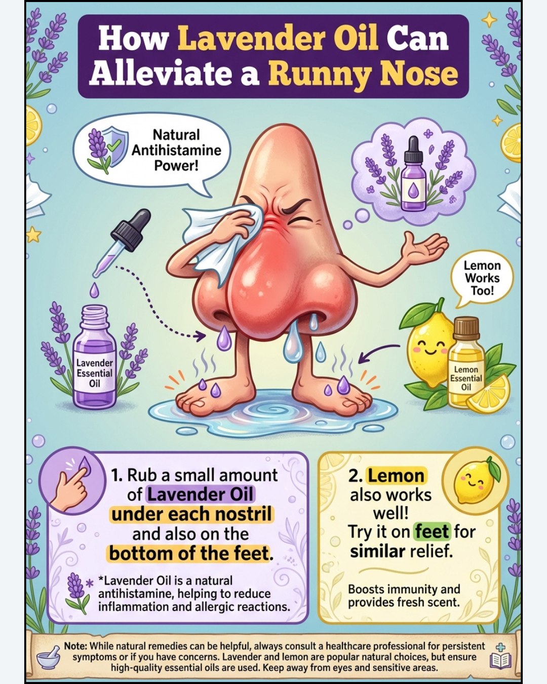 - Lavender oil helps calm inflammation—that’s the main reason your nose won’t quit running.