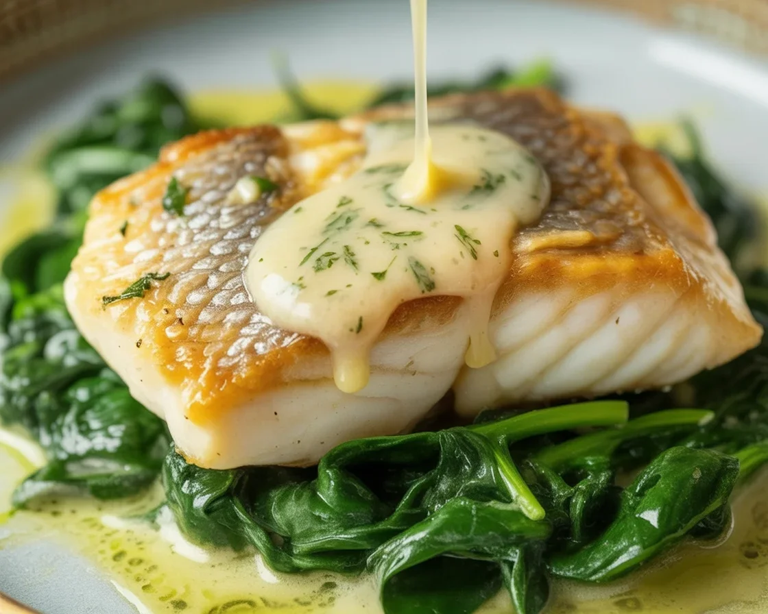 - Spoon the creamed spinach onto plates, then place the sea bass on top.