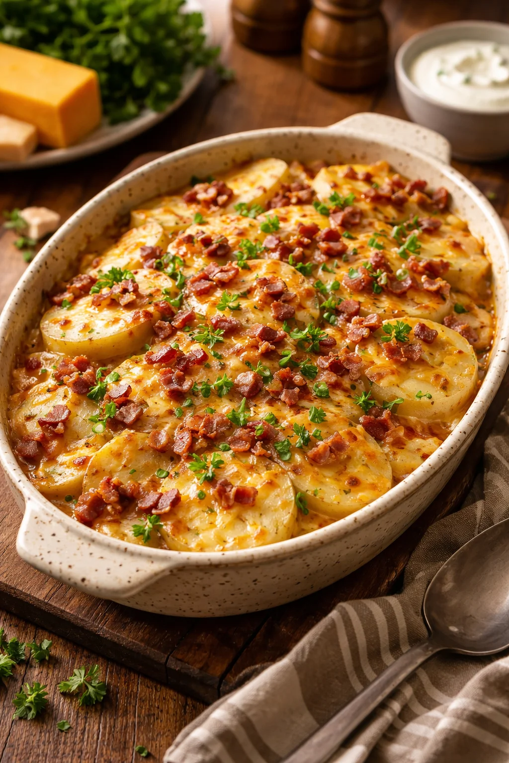 Hey, I’m Alexandraa! This LOADED SCALLOPED POTATOES was built for family tables: simple steps, reliable results, and flavor that makes people ask for seconds. LOADED SCALLOPED POTATOES are what I make when I want something cozy and cheesy, but I do not feel like babysitting a complicated recipe. You know…