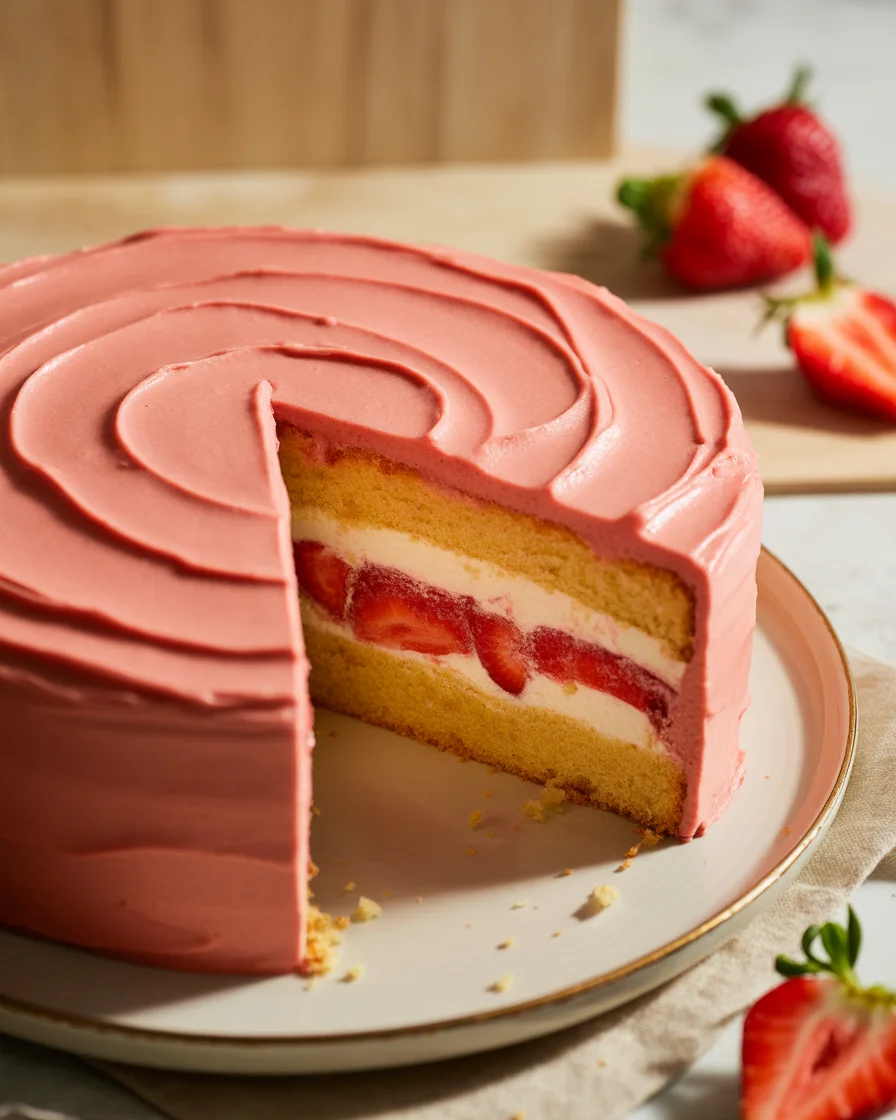 For frosting, I go with a cream cheese buttercream that’s not overly sweet. It balances the cake perfectly. If your frosting gets too soft, chill it for 10 minutes before spreading. Want to add a little swirl style? Try a thin drizzle of strawberry reduction on top and gently swirl with a knife. For more pretty pink inspiration, you might like this fun twist on a swirl cake right here: Strawberry Swirl Cake with Strawberry Glaze.