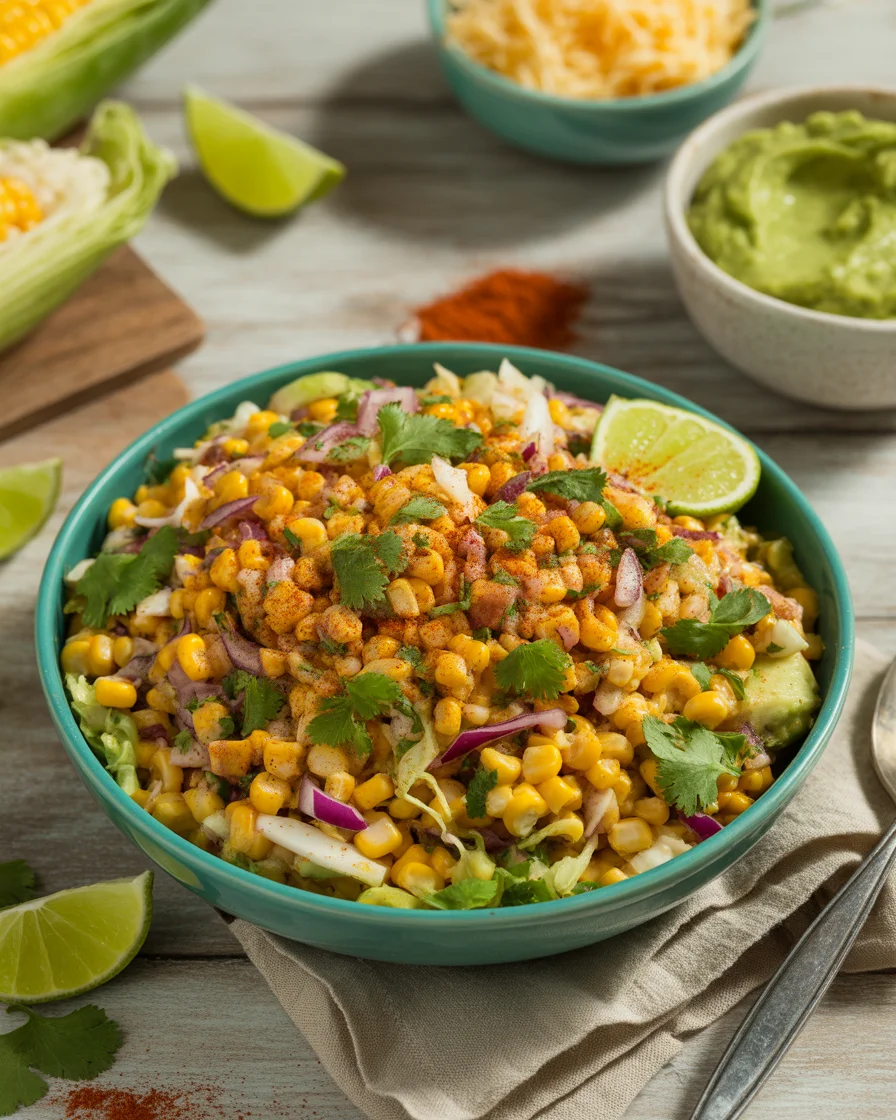 You know those recipes that look like you fussed for hours, but you only washed one cutting board and a bowl? That’s this. The key to maximum flavor is balance. Fresh lime to wake things up. Salt to make the corn pop. A spicy note that’s there but not bossy. Crunch that stays crunchy. And creamy dressing that doesn’t drown the vegetables.
