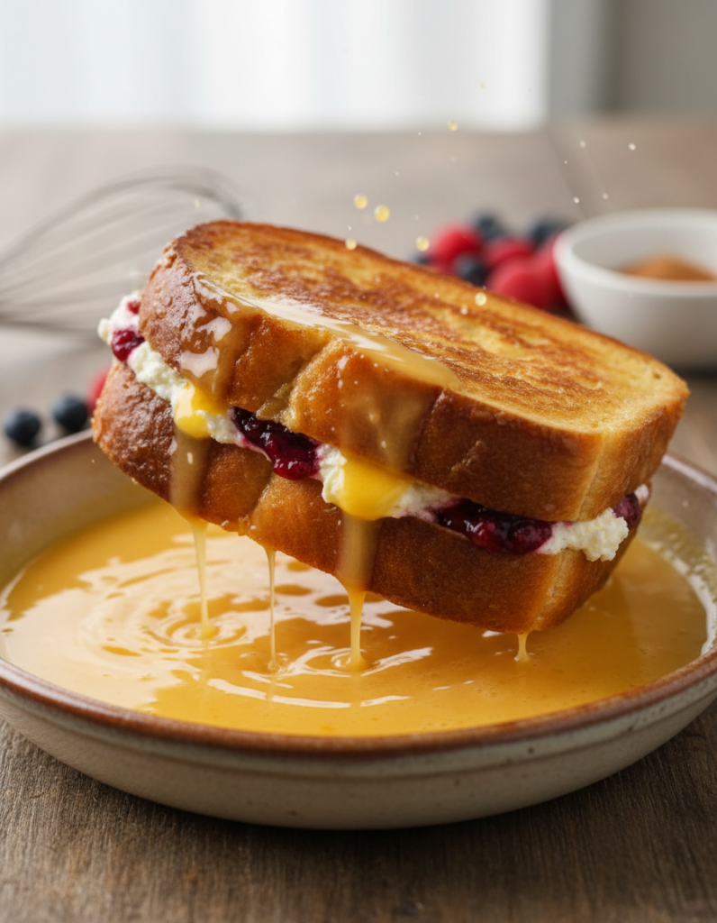 - Dip the assembled sandwich into the egg mixture, making sure both sides are completely coated.