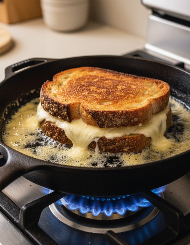 - Fry the sandwich in the skillet until the bread is golden and the cheese is gooey, about 5-7 minutes on each side.