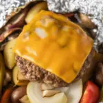 Next up: Stack everything in the middle of a sheet of nonstick foil. If you want those burger patties plump and juicy, don’t smash them out flat. Top those babies with swiss cheese, toss on the veggies, and then close everything up so the steam works its magic. I usually toss it straight on the grill at medium-high heat, or, y’know, sometimes just in the oven at 400 for about 25 minutes.