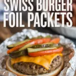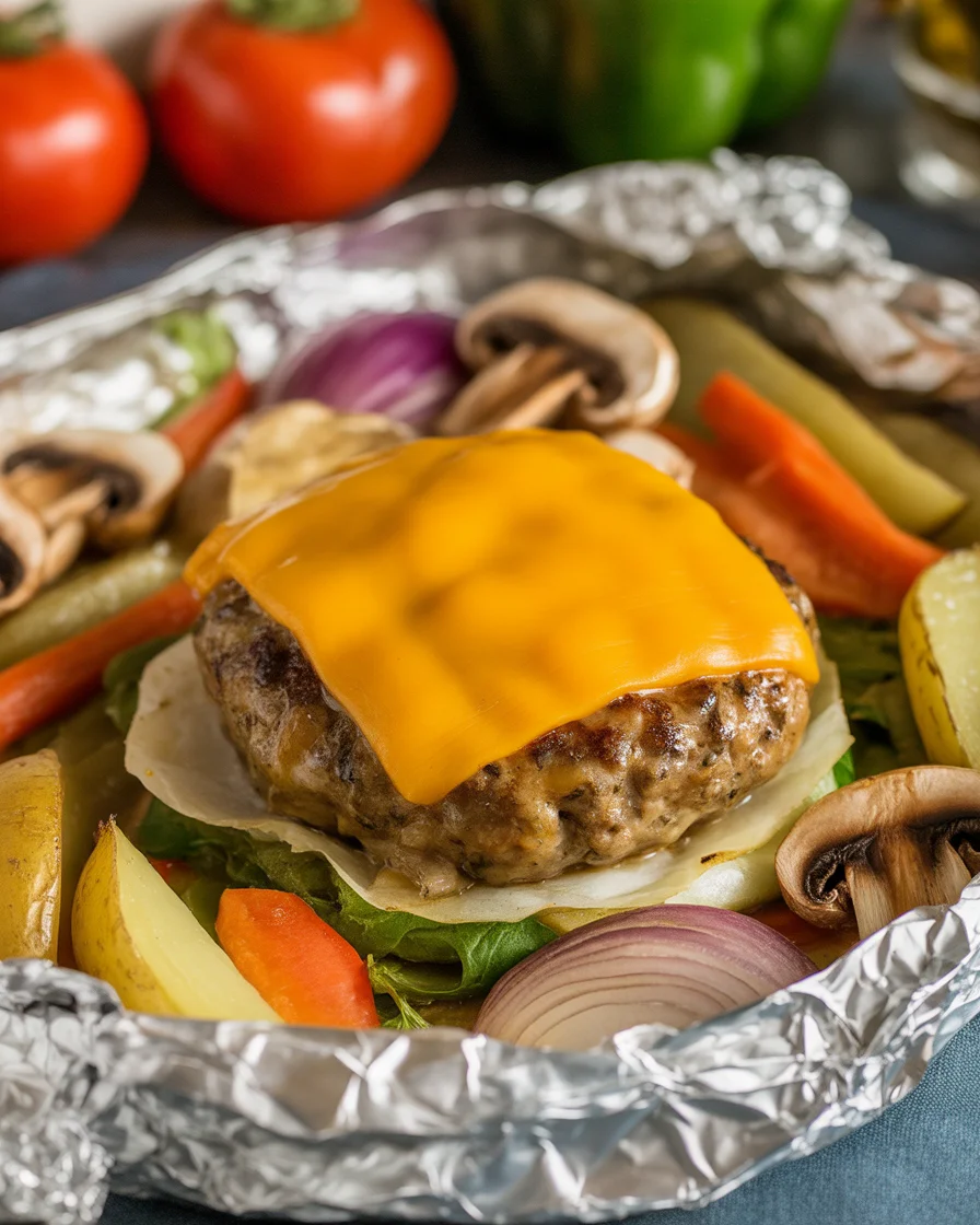 Next up: Stack everything in the middle of a sheet of nonstick foil. If you want those burger patties plump and juicy, don’t smash them out flat. Top those babies with swiss cheese, toss on the veggies, and then close everything up so the steam works its magic. I usually toss it straight on the grill at medium-high heat, or, y’know, sometimes just in the oven at 400 for about 25 minutes.