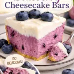 - Add the blueberry topping: Spread blueberry pie filling over the top. Then chill until set, at least 4 hours, but overnight is even better.