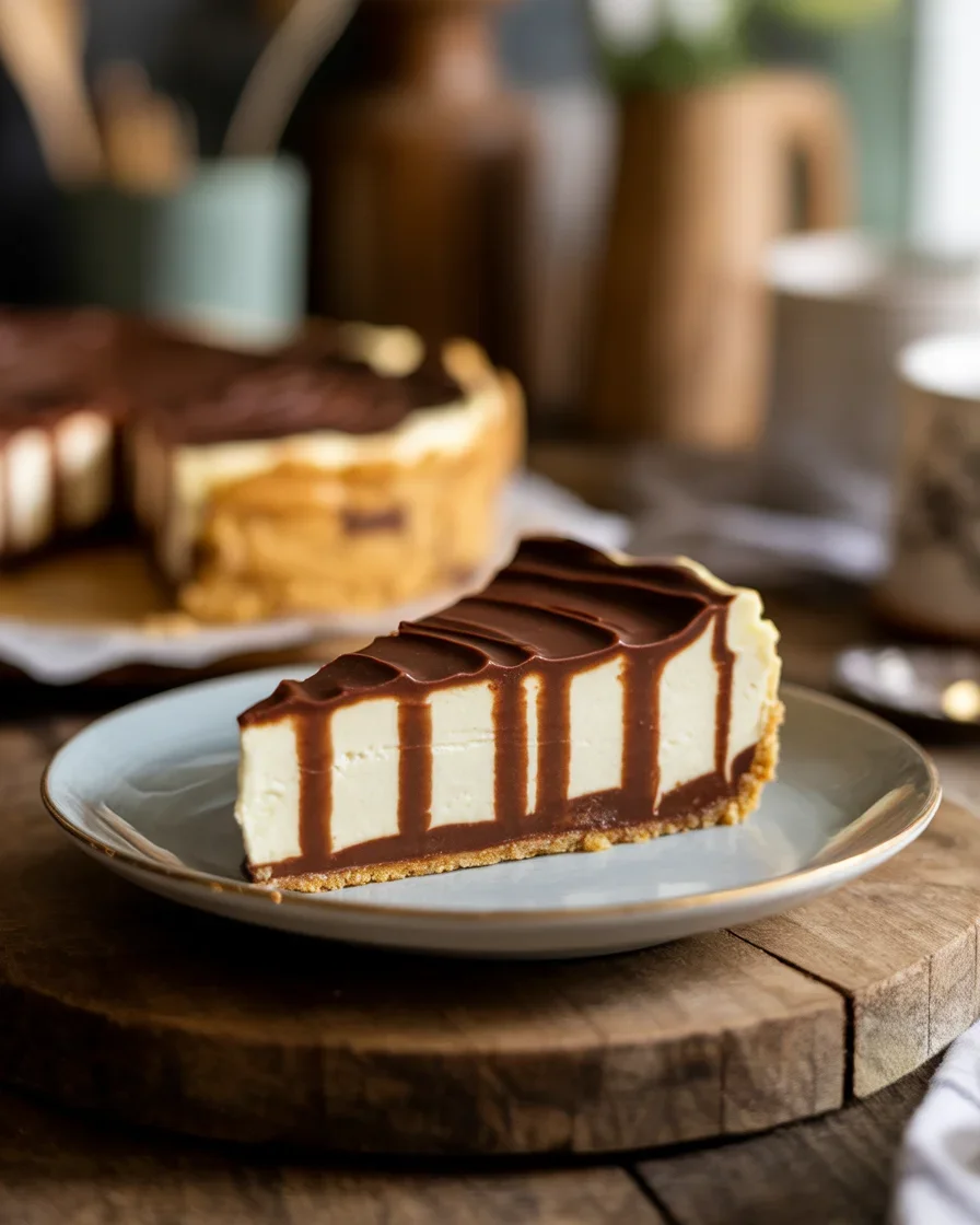 The crust stays crisp if you chill it long enough. The peanut butter is front and center, but the fudge swirl keeps things balanced with deep chocolate notes. It’s forgiving too. If your swirl gets a little messy, it still looks gorgeous once set.
