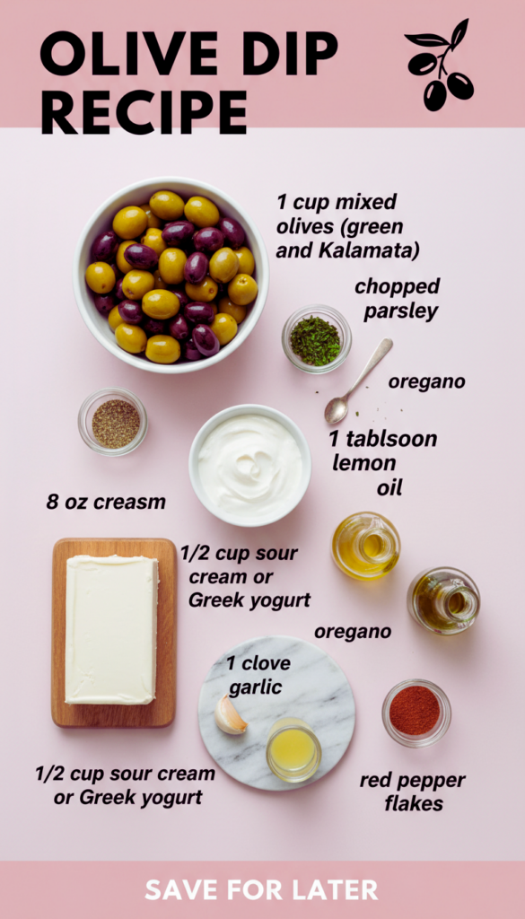 Let’s talk about what actually makes this dip great. The ingredient list is simple, but the little choices matter. My go to Olive Dip Recipe is built on a creamy base, a punchy olive flavor, and a few bright add ins that keep it from tasting flat.
