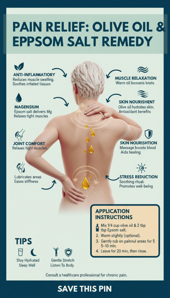 Alrightโif youโre wrestling with aches and pains, donโt overlook this simple olive oil and Epsom salt rub. No science degree required, just a little curiosity and some pantry basics. Plus, itโs way easier to try at home than those mysterious โmiracleโ creams you see online.
