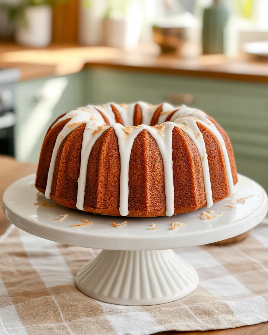 Whisk powdered sugar with pineapple juice, coconut milk, and a tiny pinch of salt. You want a thick but pourable glaze. If it is too thick, add more juice by the teaspoon. If it is too thin, add powdered sugar. Drizzle over the cooled cake so it hugs the ridges.