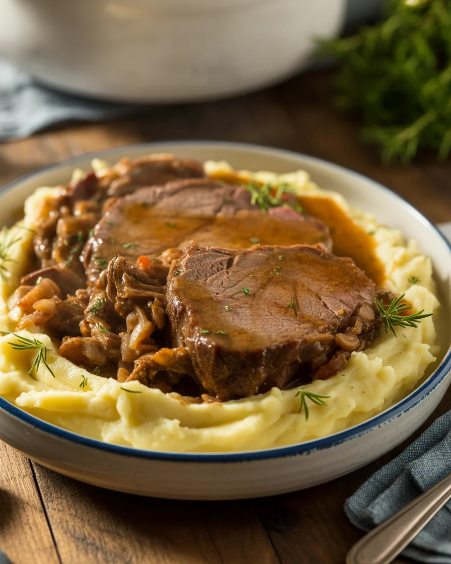 Lean cuts like sirloin tip can dry out and come out tough. Save those for faster cooking methods. Pot Roast over Mashed Potatoes really shines when you use a cut built for low and slow cooking, because time and moisture do the magic.