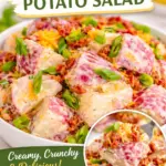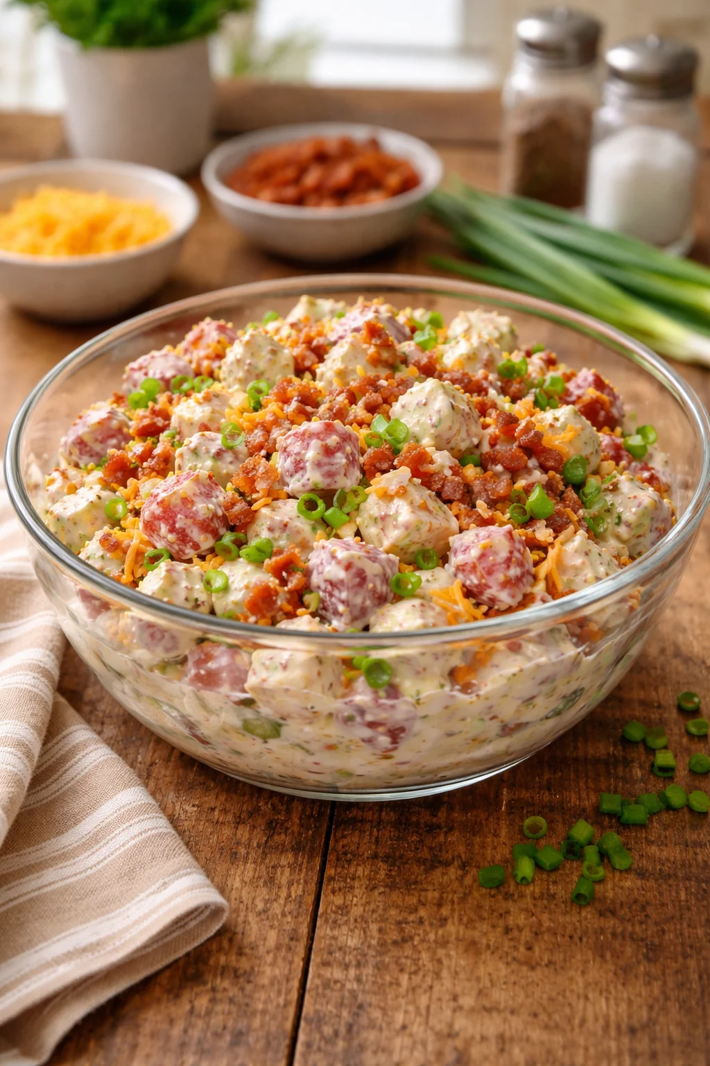 Boil the potatoes, drain, and cool. Mix the dressing separately if you want the freshest texture. Then combine everything a few hours before serving. If you are making it fully ahead, just hold back a splash of ranch or a spoonful of mayo to refresh it later.