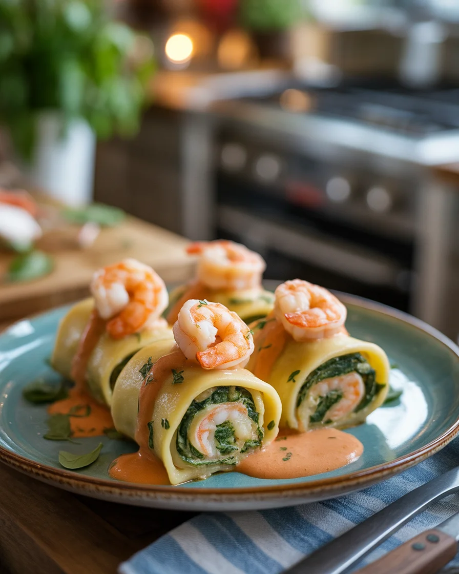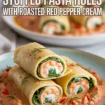 Home » Shrimp and Spinach Stuffed Pasta Rolls with Roasted Red Pepper Cream