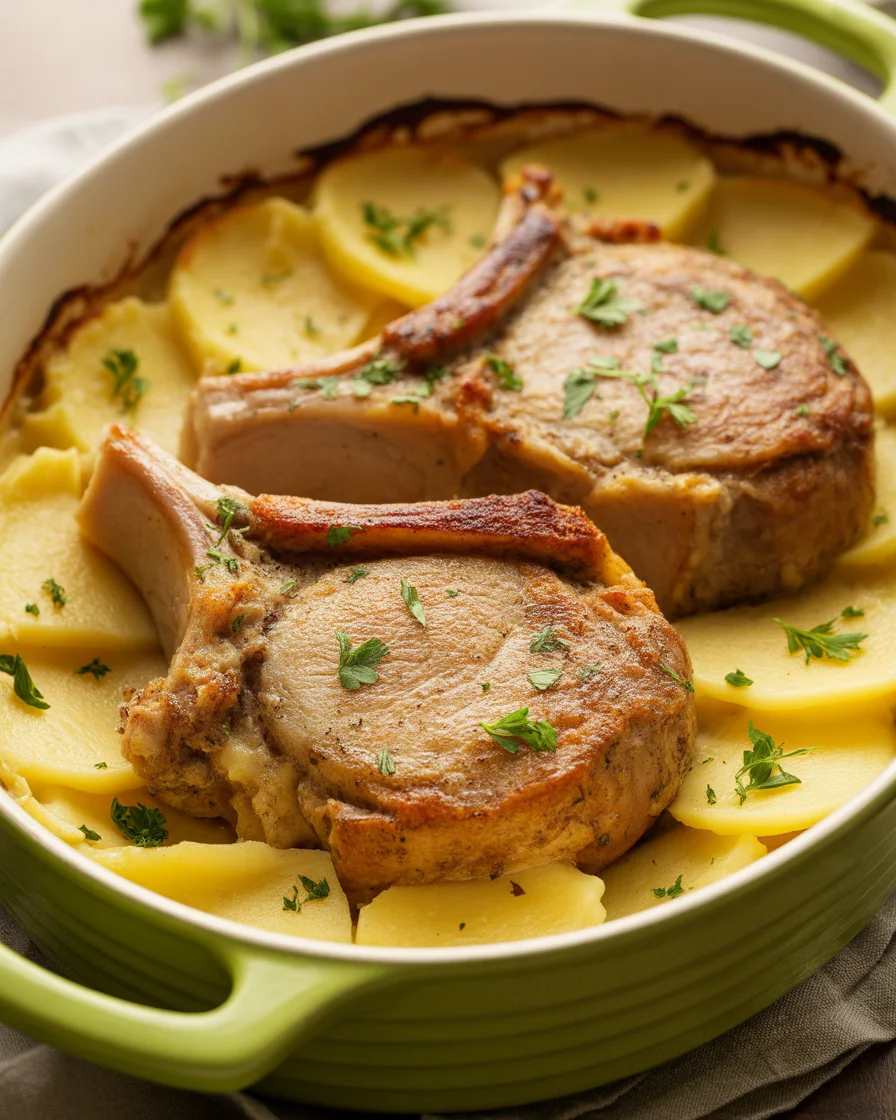 This dish checks so many boxes. It is comforting, budget friendly, and incredibly forgiving for busy cooks. You get juicy pork chops tucked into layers of thinly sliced potatoes, all baked in a creamy onion sauce until the top is golden and the edges are bubbling. I make it for Sunday dinner, then I reheat slices for weekday lunches. The flavor only gets better as it sits.